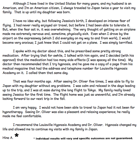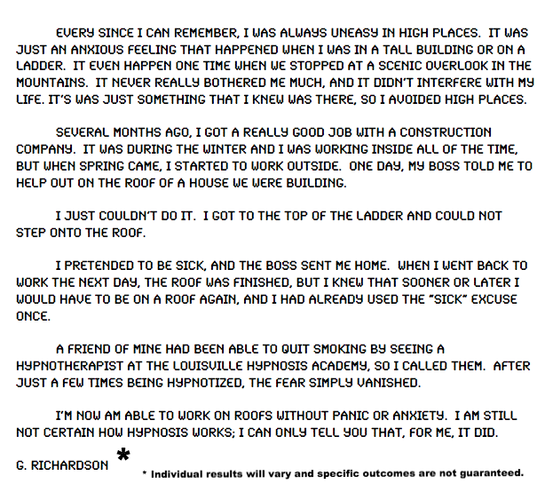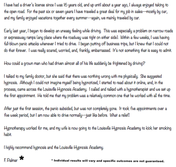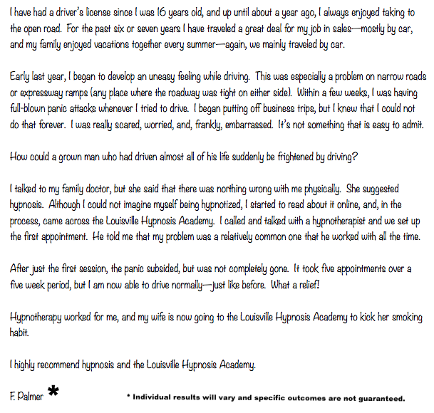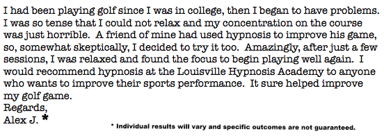 Individual results will vary and specific outcomes are not guarantted. The photos shown above are of actual clients of the Louisville Hypnosis Academy or, in order to protect the privacy of clients, representations of actual clients.  The comments shown above are actual comments of clients of the Louisville Hypnosis Academy or clients of Certified Hypnotherapists who work with the Louisville Hypnosis Academy. Clients have agreed in writing to allow the use of their image and/or comments on our website. Comments have been edited, consolidated, or paraphrased, with the approval of the clients, to control length and/or to provide clarity without changing the overall meaning.