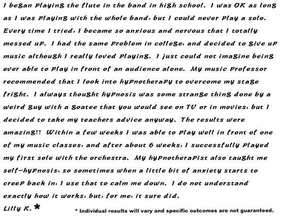 Please note: Hypnosis and hypnotherapy is a powerful tool to help you achieve outcomes that you have not be able to achieve on your own.  While many of our clients experience outstanding positive results, we cannot guarantee any specific outcome.  Of course, this is true in any situation where a professional is trying to help you.  For example, physicians cannot guarantee that you will get well, teachers cannot guarantee that you will learn, and lawyers cannot guarantee that you will win your case.  What we can guarantee is that your Certified Hypnotherapist will do his or her very best to help you experience the positive outcome that you are seeking.